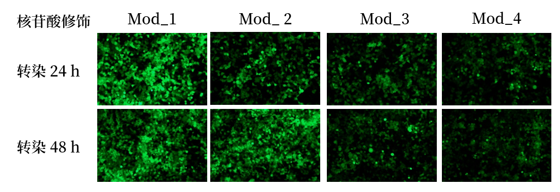 青鸟核酸测试了不同类型的修饰核苷对mRNA体外表达的影响。我们在IVT反应中掺入不同的修饰碱基,然而通过293T细胞试验评估增强绿色荧光蛋白(eGFP)mRNA的表达水平。结果显示,核苷酸修饰对eGFP mRNA的荧光强度具有明显影响。